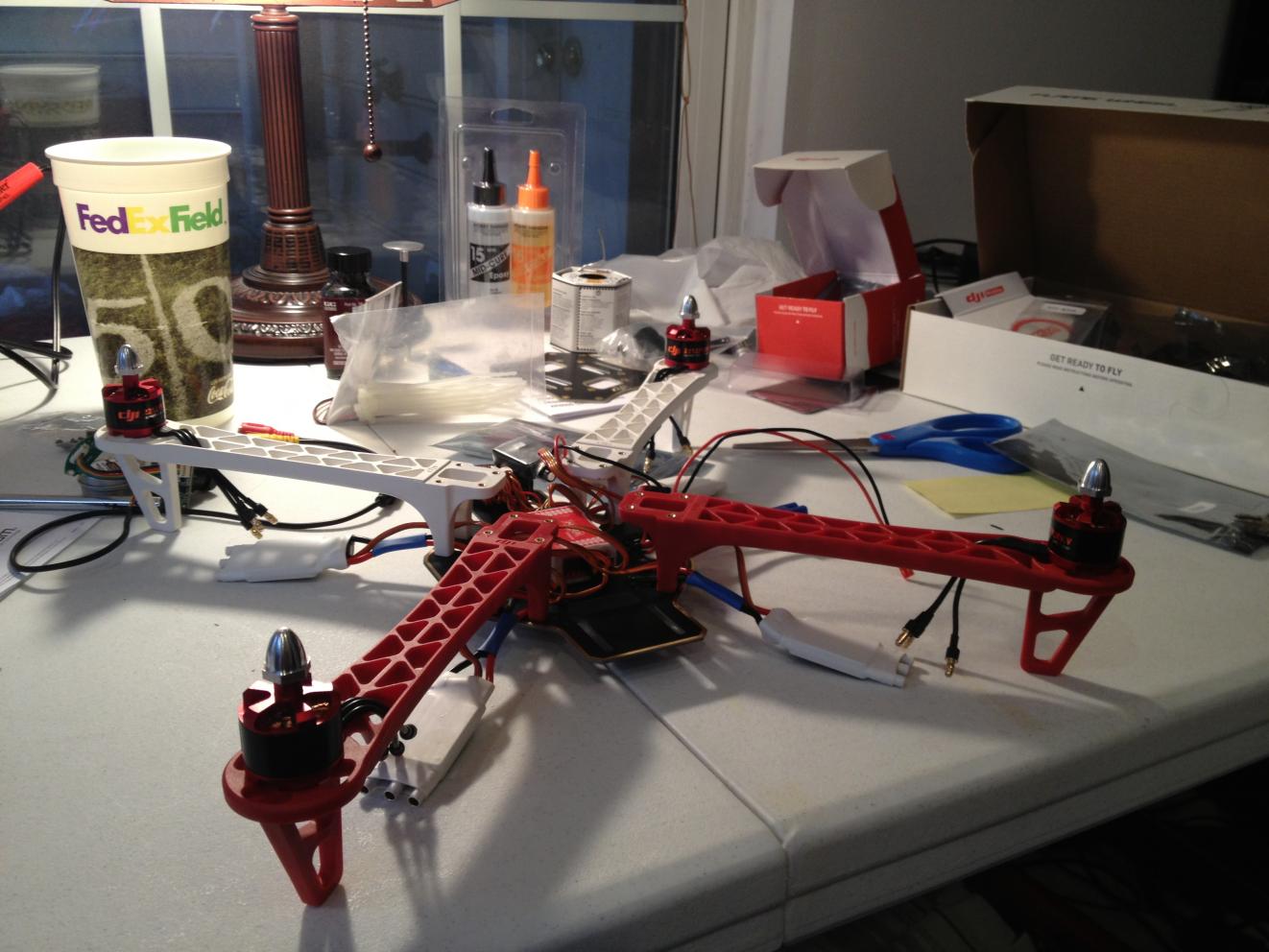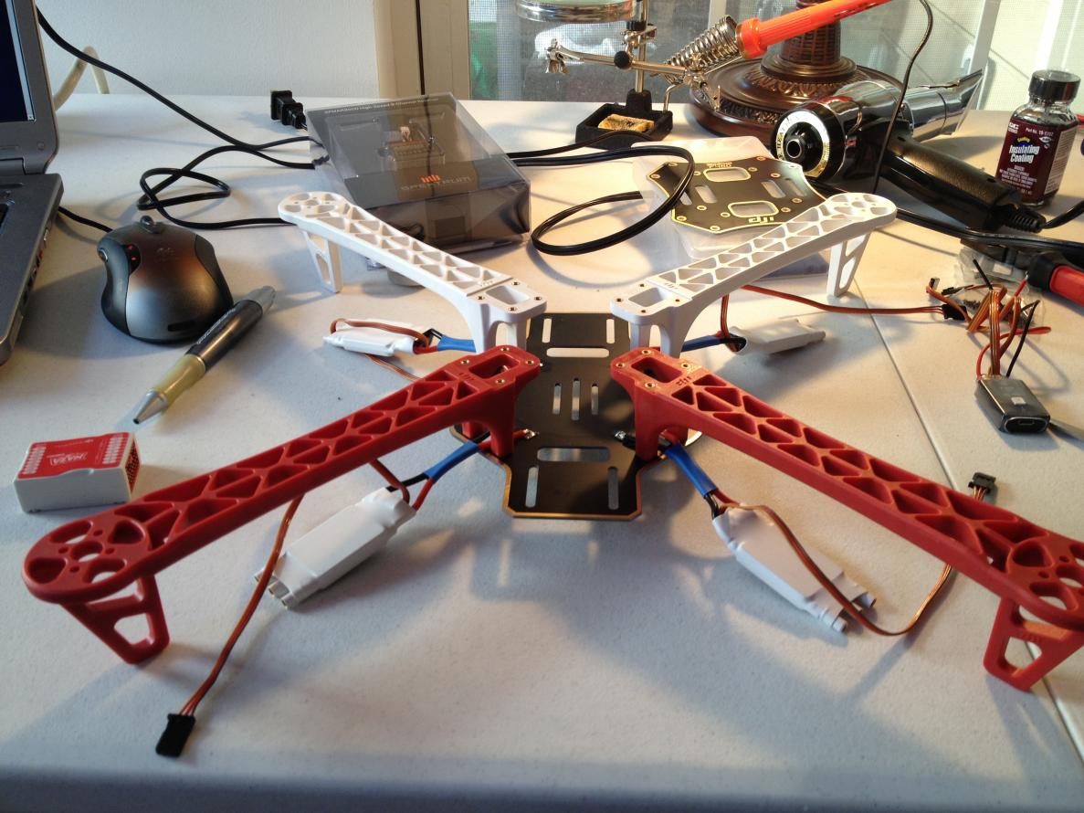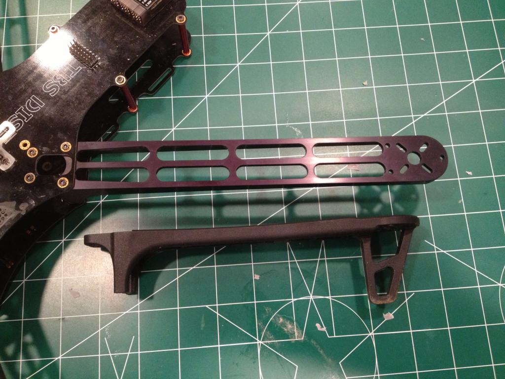 Here are some shots of my 450 and 550 setups. The 450 CF sticks weigh nothing (almost) I grooved them on a milling machine and Zip-tied them to the 450, they are very solid.