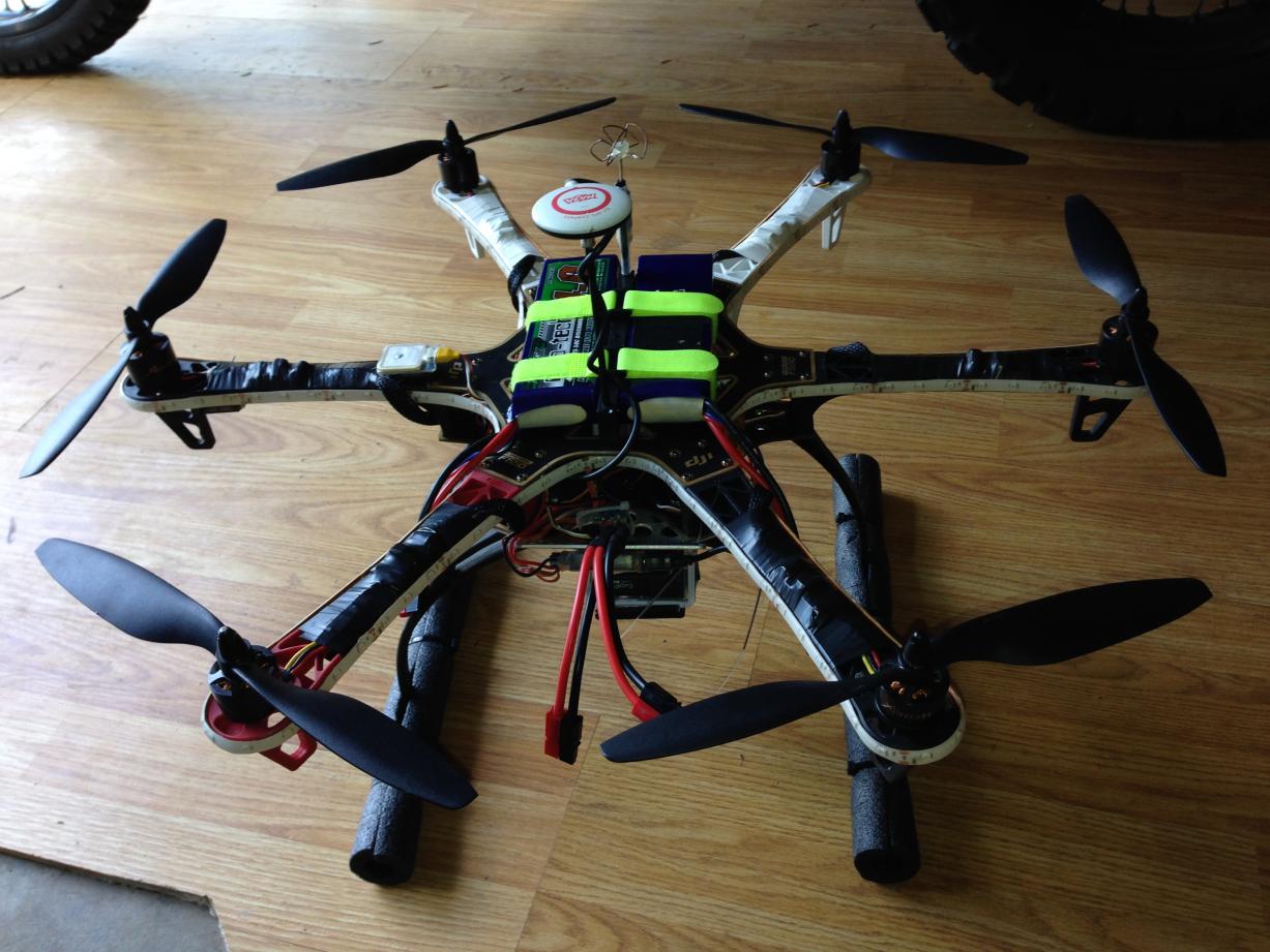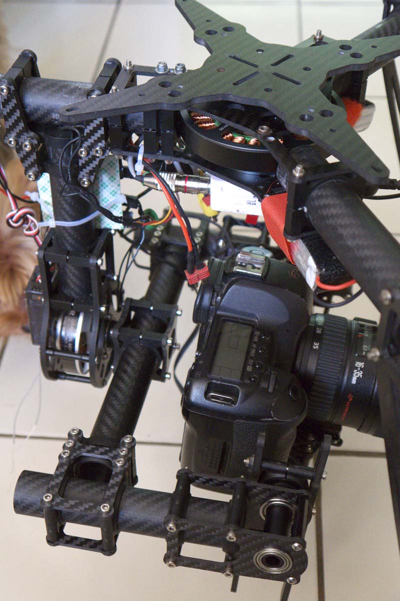It now has longer arms, bigger motors, runs bigger props, has a GoPro Hero 2 for photography, and I've just added a "pilot cam" and video transmitter which send video back to me to view on a 10" LCD monitor. I can switch between what the pilot cam sees (it's a view as if you are "in" the quadcopter) and what the GoPro is filming. Two nights ago I added and On Screen Display (OSD) which superimposes data on the video screen such as speed, height above takeoff point, direction back to home, battery voltage (i.e. how soon is it coming down!), and more. A package is enroute with a gimbal so I can tilt the camera up and down and compensate for roll to give a steadier image.