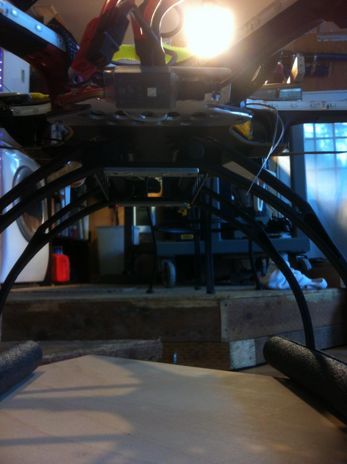 The aluminum Y connection and the rod ends comprise the majority of weight of the frame. However, the mechanical functionality of the design necessitates geometric rigidity which those parts provide. Considering the weight of the bare frame with these parts is calculated to be 1882 grams, I think the strength/weight ratio is within reason for an X8 28"+ prop multirotor. This combination with 1900g of motors, 28" props, 3150g of 24 Ah batteries, foldable landing gear, wired and ready to fly is calculated to weigh an even 10kg. That compares favorably with the 10kg weight Ferdinandk quoted elsewhere for his big 28" rig with 4kg batteries.