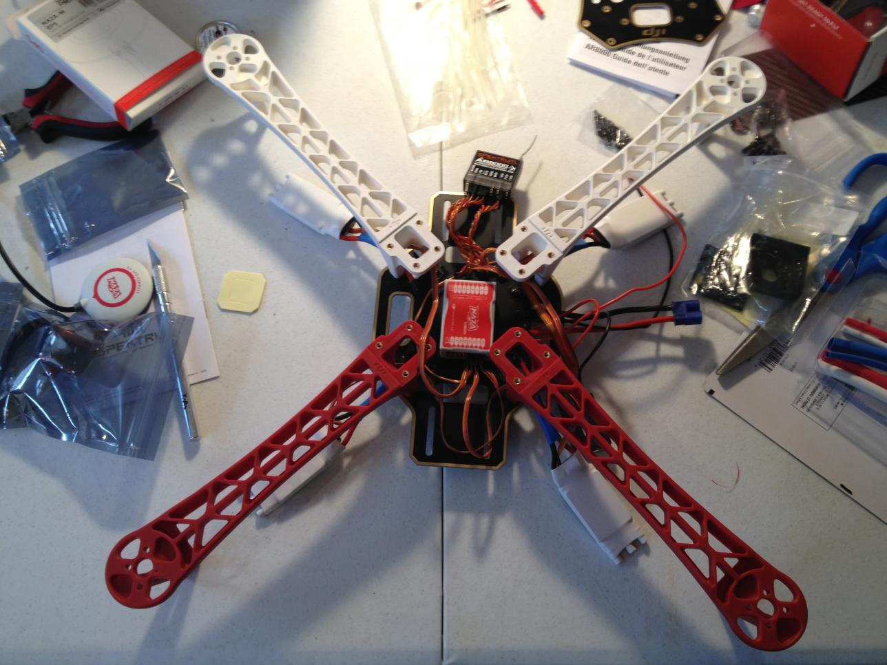 Here are some shots of my 450 and 550 setups. The 450 CF sticks weigh nothing (almost) I grooved them on a milling machine and Zip-tied them to the 450, they are very solid.