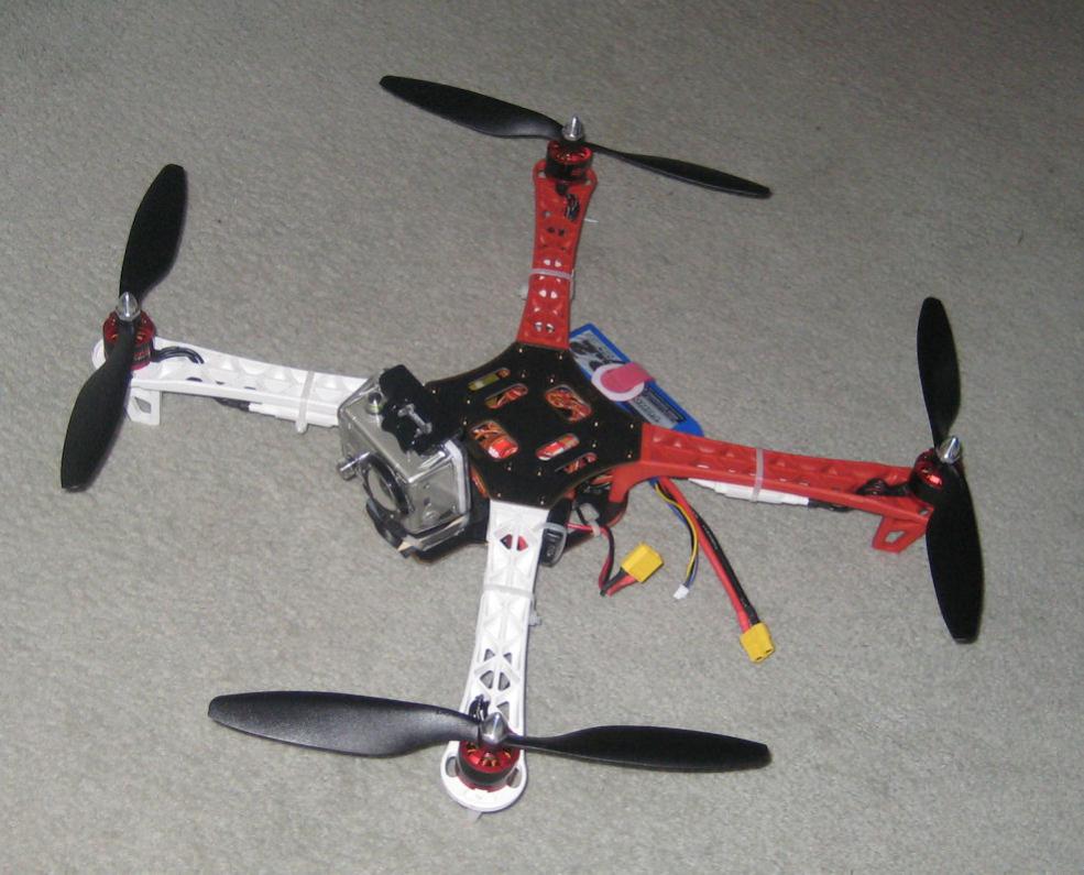 Here she is. Ready for her maiden voyage tomorrow morning. I improvised the bottom plate from a sheet of G10. I may or may not keep it. I'd rather make it from a carbon fiber sheet. The top plate that holds the GPS is just the plate that the kit comes with. That will be replaced immediately once I get the carbon fiber I ordered in the mail.
